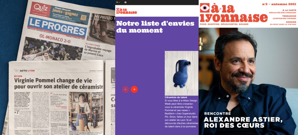 En septembre, le vase RESILI2 de la collection RESILIENT est dans la « Whishlist » du magazine A LA LYONNAISE. Lien sur le site : www.alalyonnaise.fr En octobre, le journal Le Progrès, pages Culture, tire mon portrait « Virginie Pommel change de vie pour ouvrir son atelier de céramiste ». Histoire d’une reconversion et d’un changement de cap. Lien…