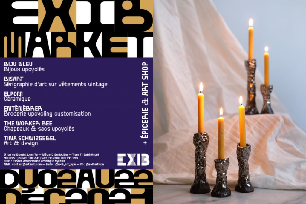 Un marché éclectique au cœur de Guillotière : bijoux upcyclés, sérigraphie d’art sur vêtements vintage, broderie upcycling, chapeaux et sacs upcyclés, céramique, art et design Avec Biju Bleu | Bisart | Elpom | Enténébrer | The Worker Bee | Tina Schwizgebel Du 2 au 22 décembre 2021 GALERIE EXIB – Espace d’eXpression artIstique hyBride 5 rue…