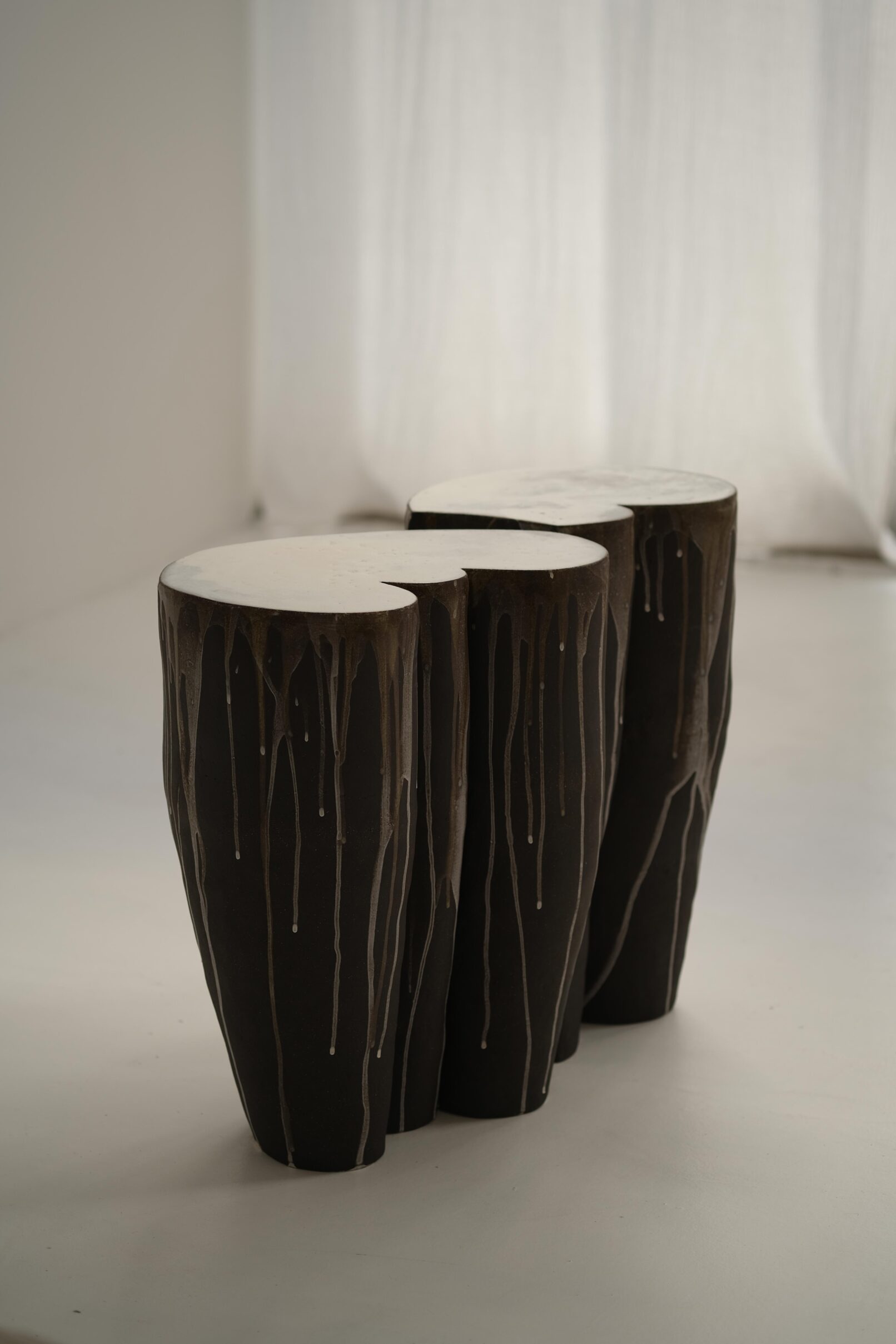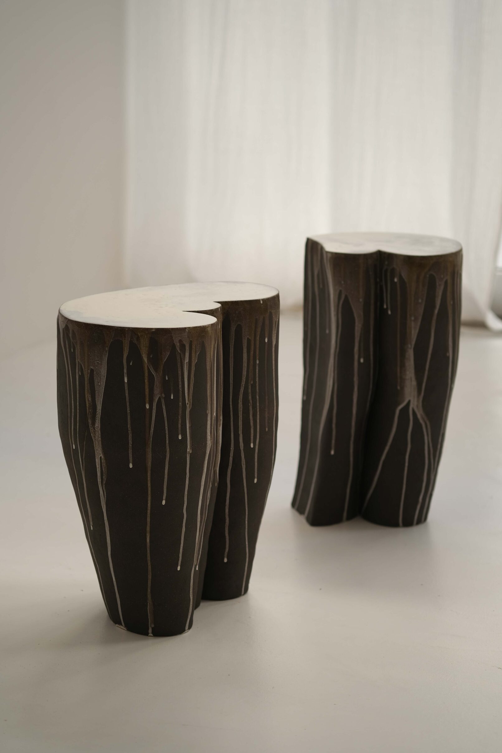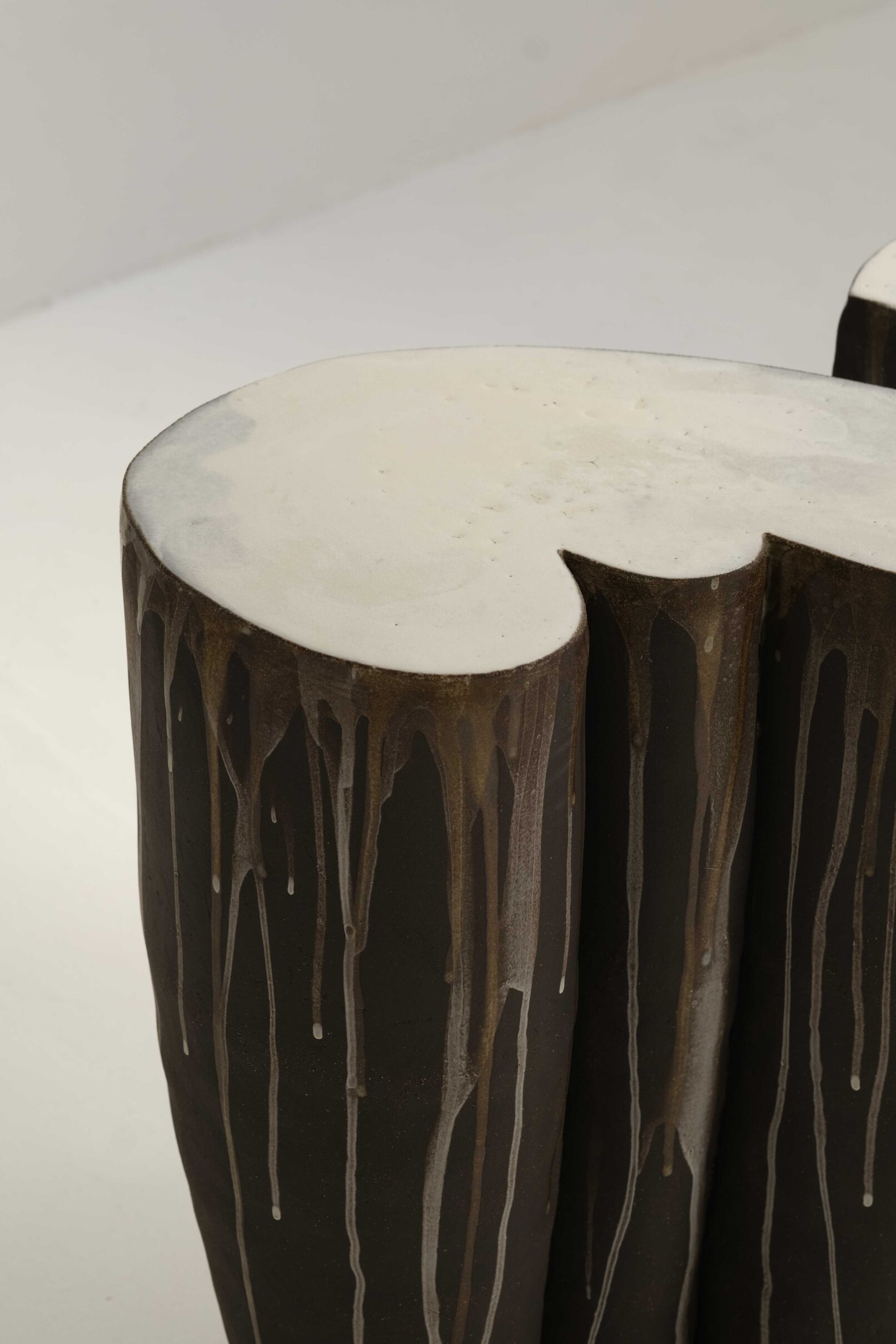 Tables d’appoint sculpture, grès noir, engobe porcelaine, email blanc mat, dimension 47 x 28 x 22 cm et 47 x 37 x 25 cm, poids 13kg et 19kg