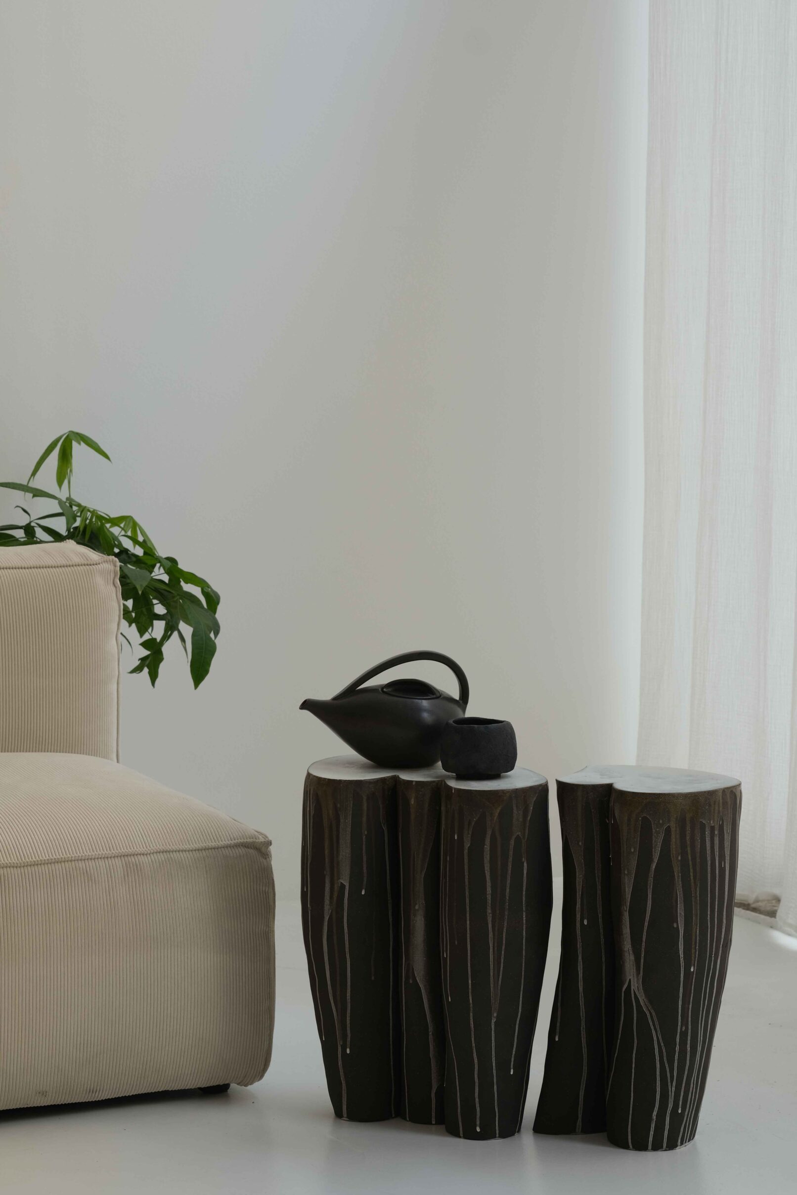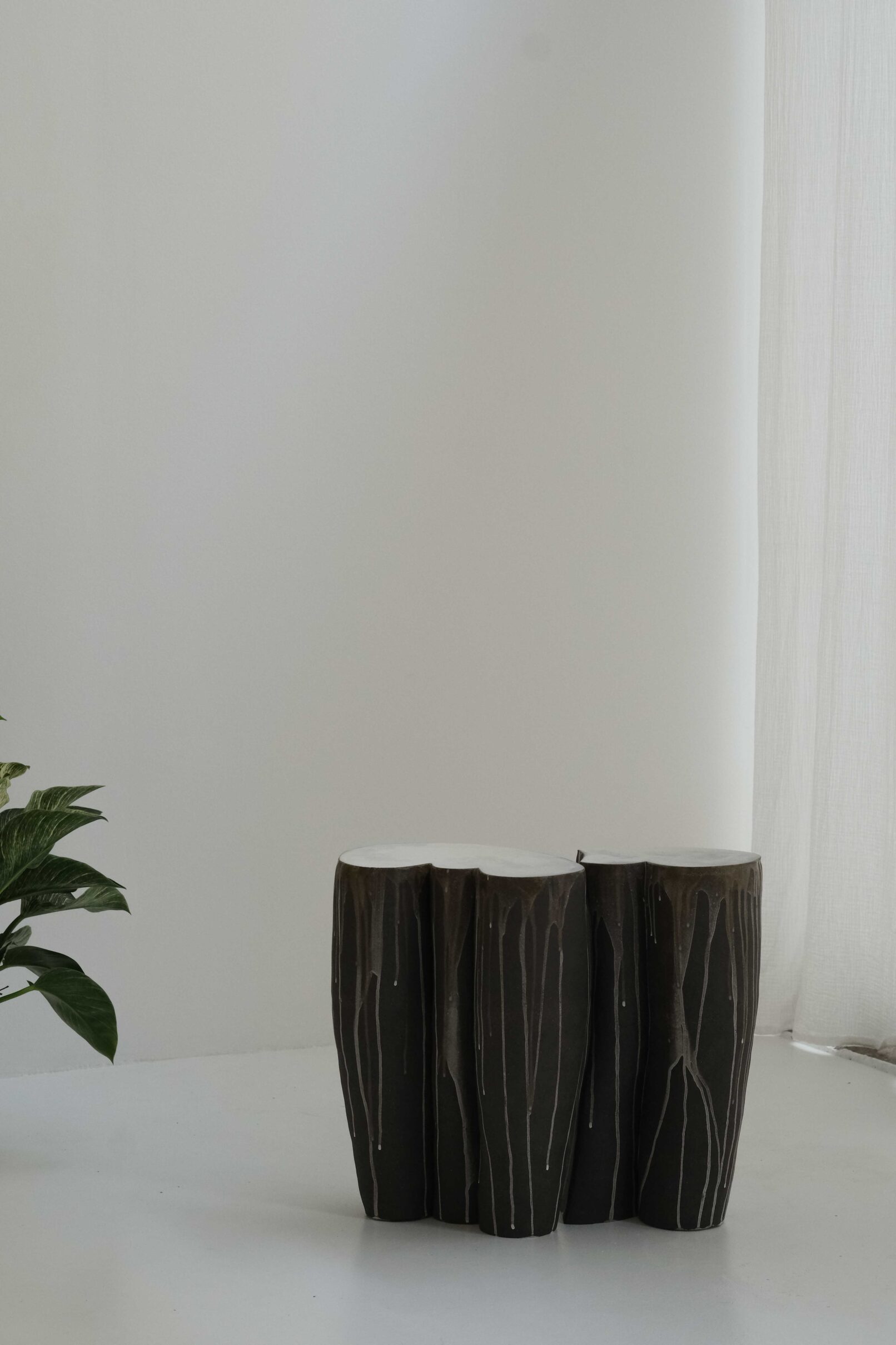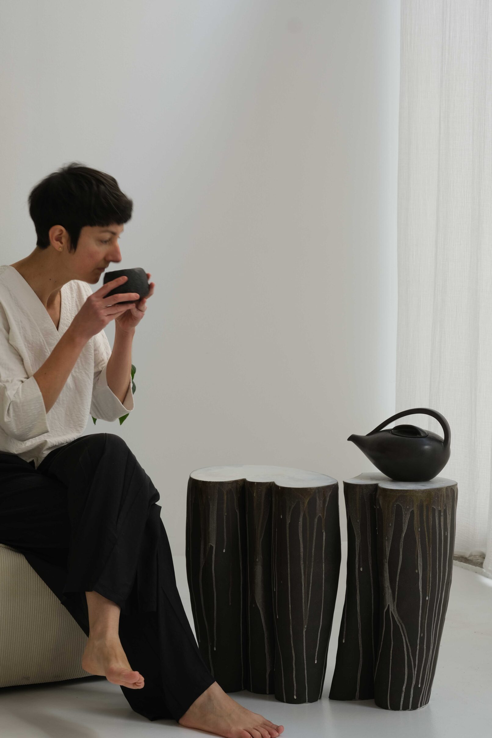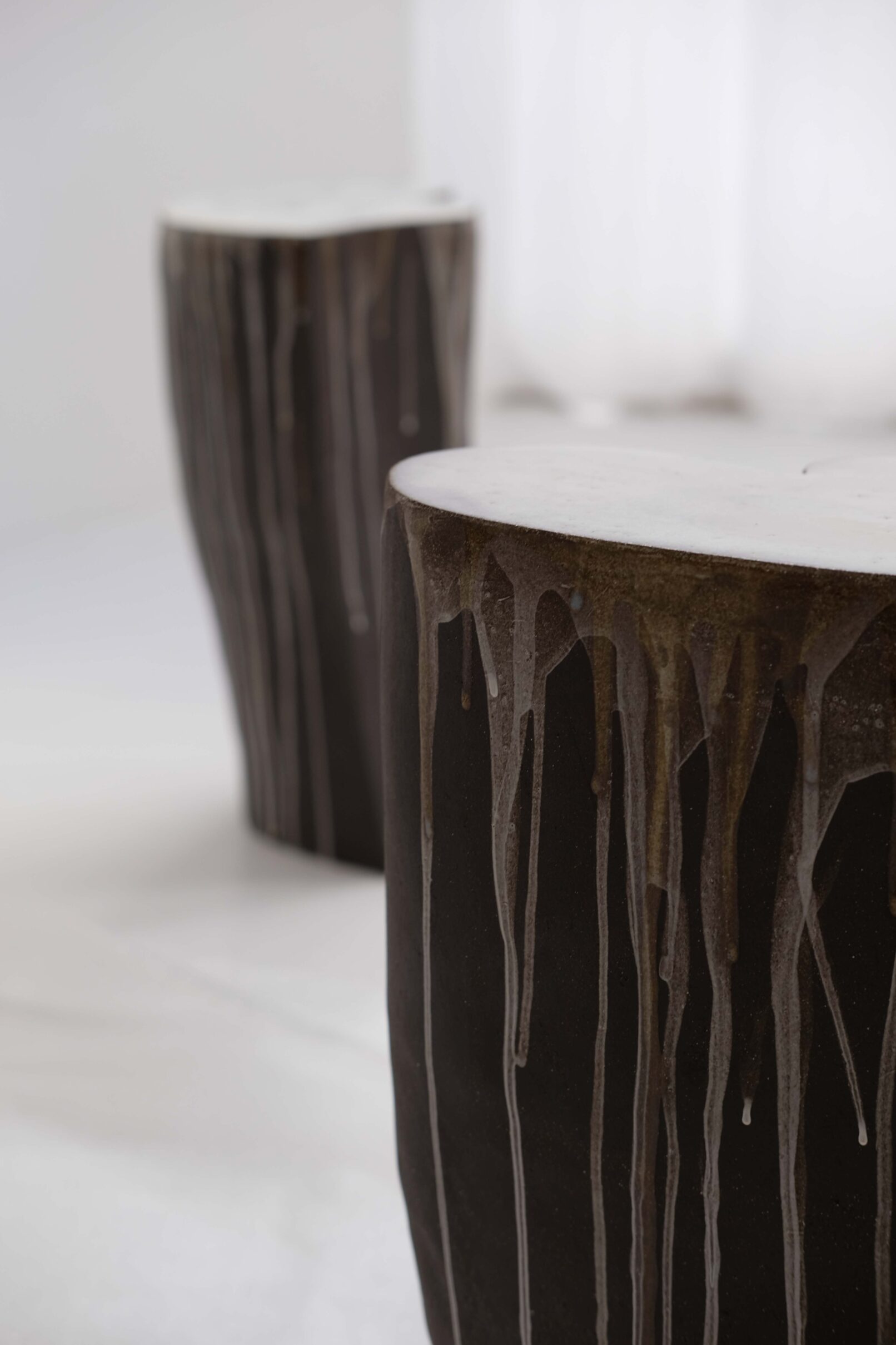 Tables d’appoint sculpture, grès noir, engobe porcelaine, email blanc mat, dimension 47 x 28 x 22 cm et 47 x 37 x 25 cm, poids 13kg et 19kg