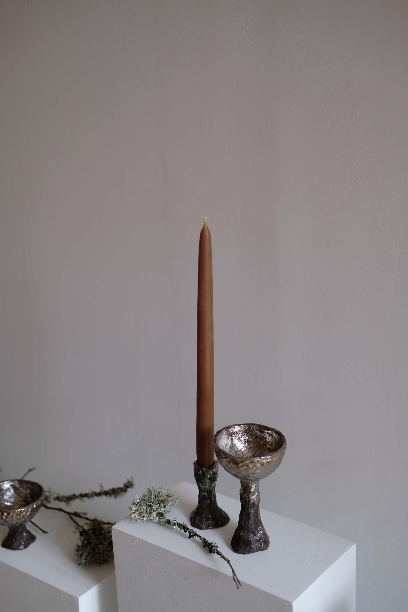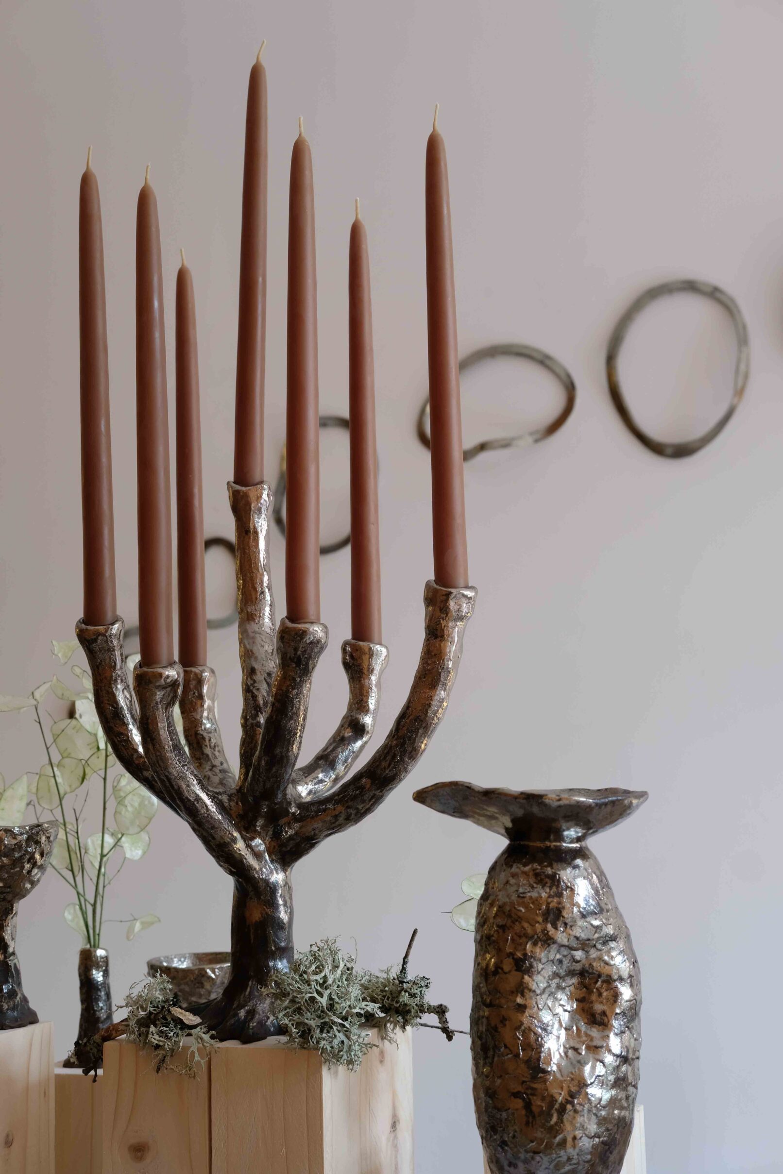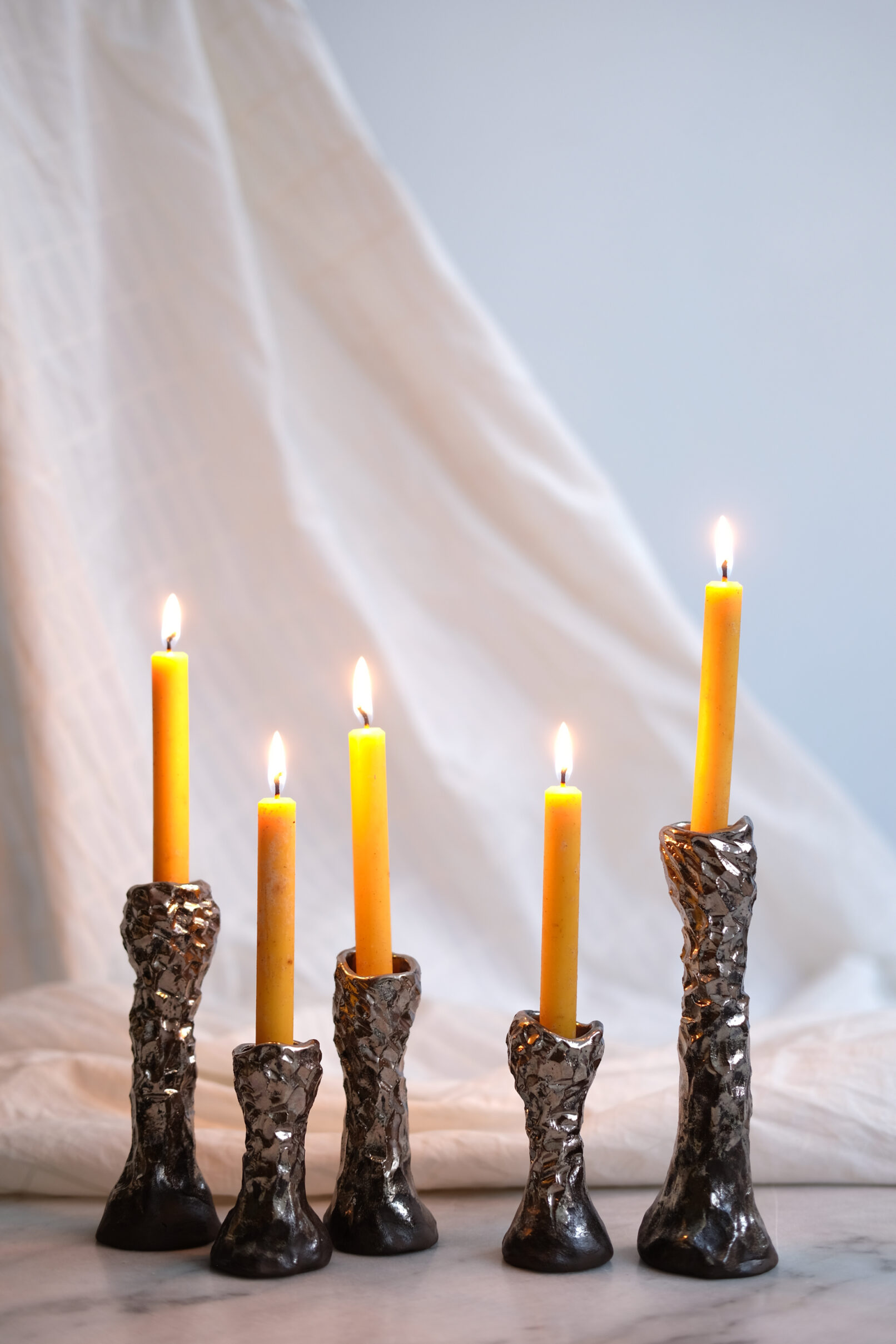 Bougeoirs et chandeliers, série ORIGINES, en grès noir et email platine, dimensions variables
