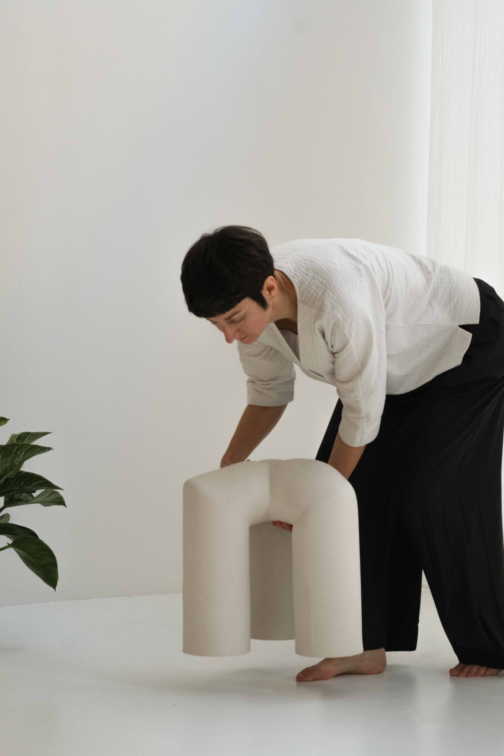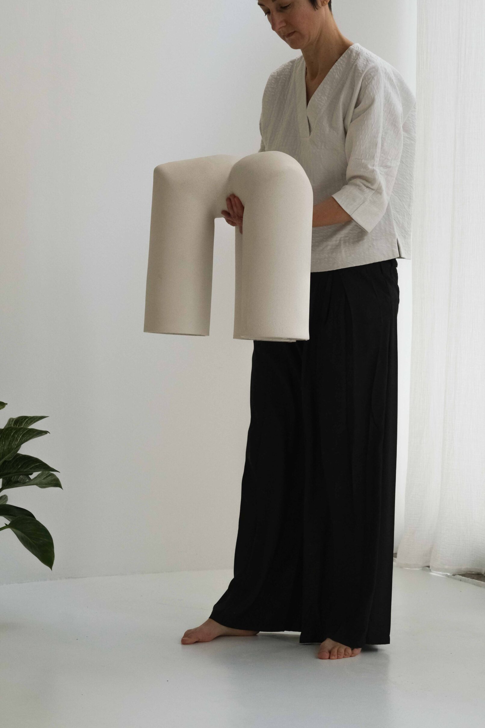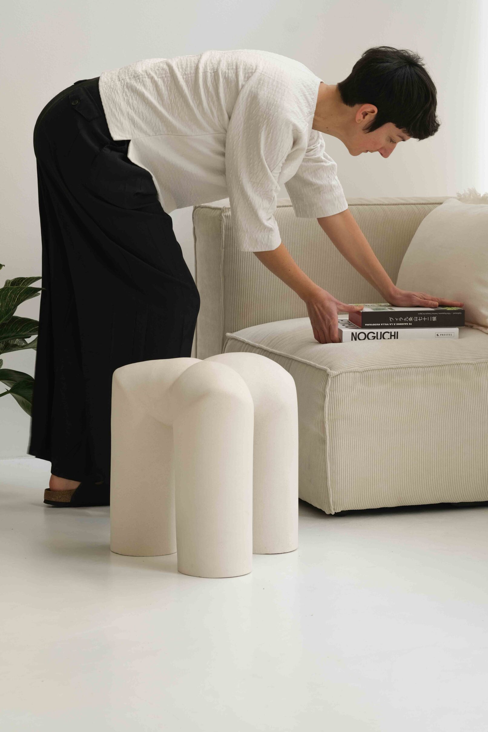 Tabouret sculpture en grès ivoire ou blanc, dimensions 40 x 36 x 36 cm, poids 12kg