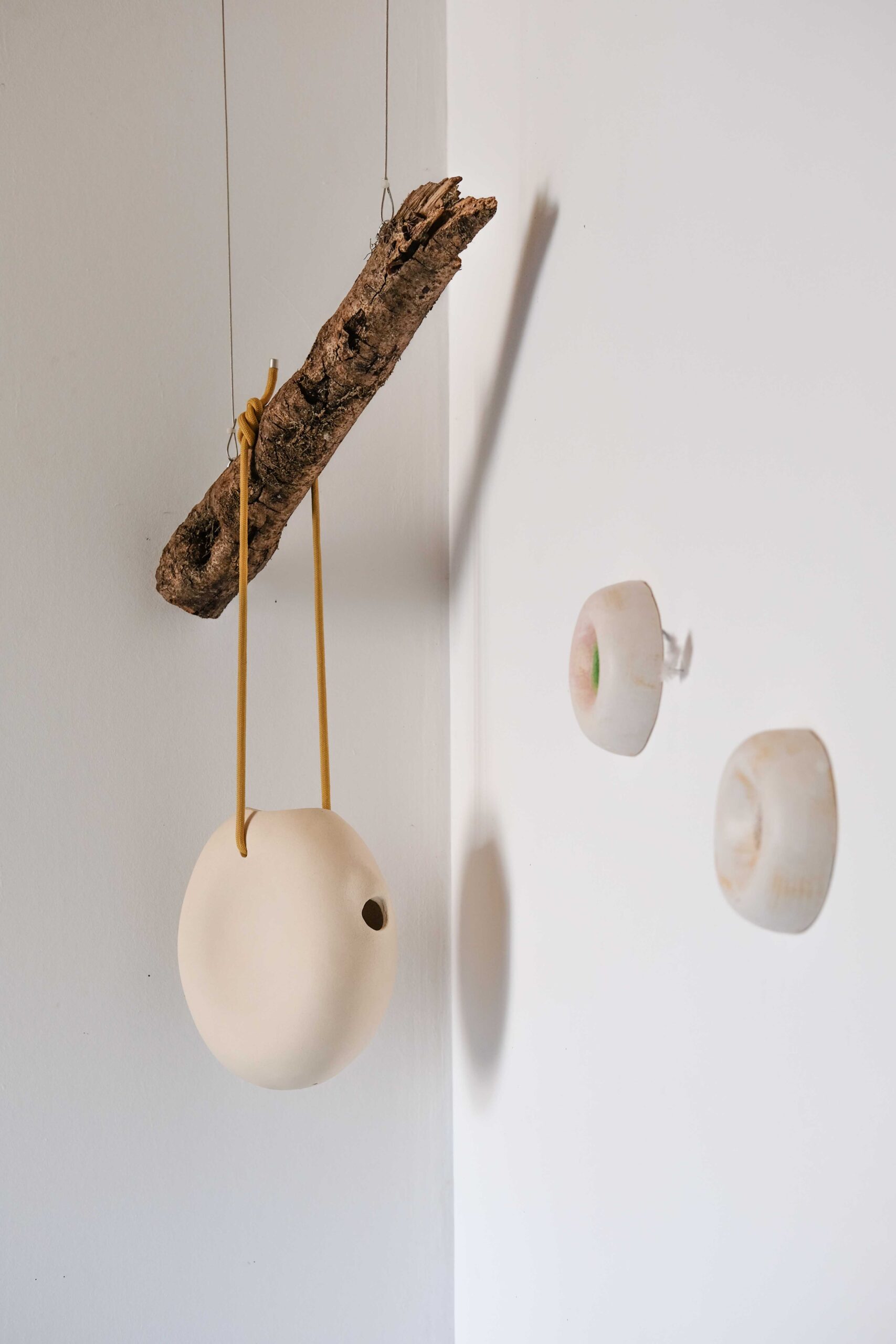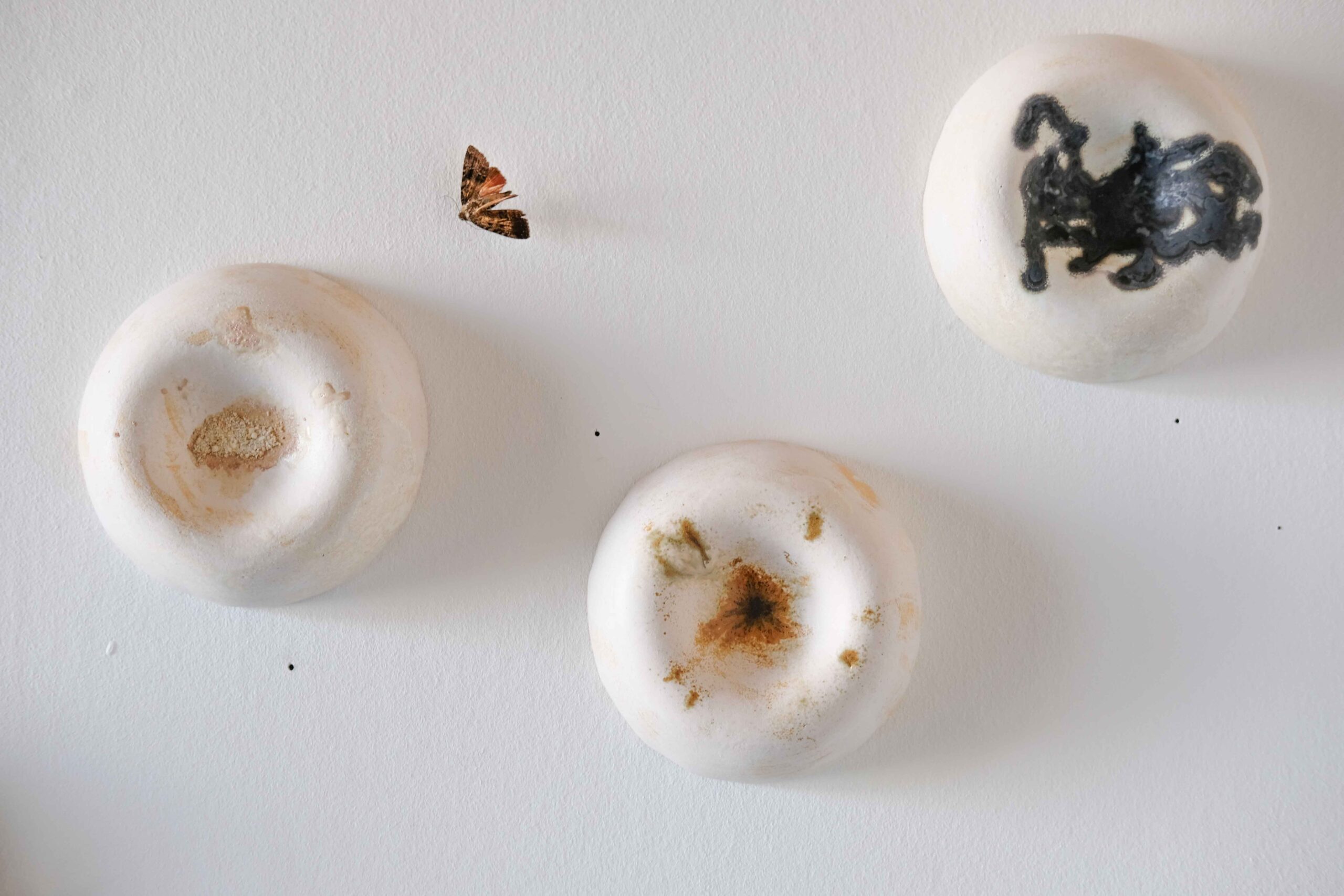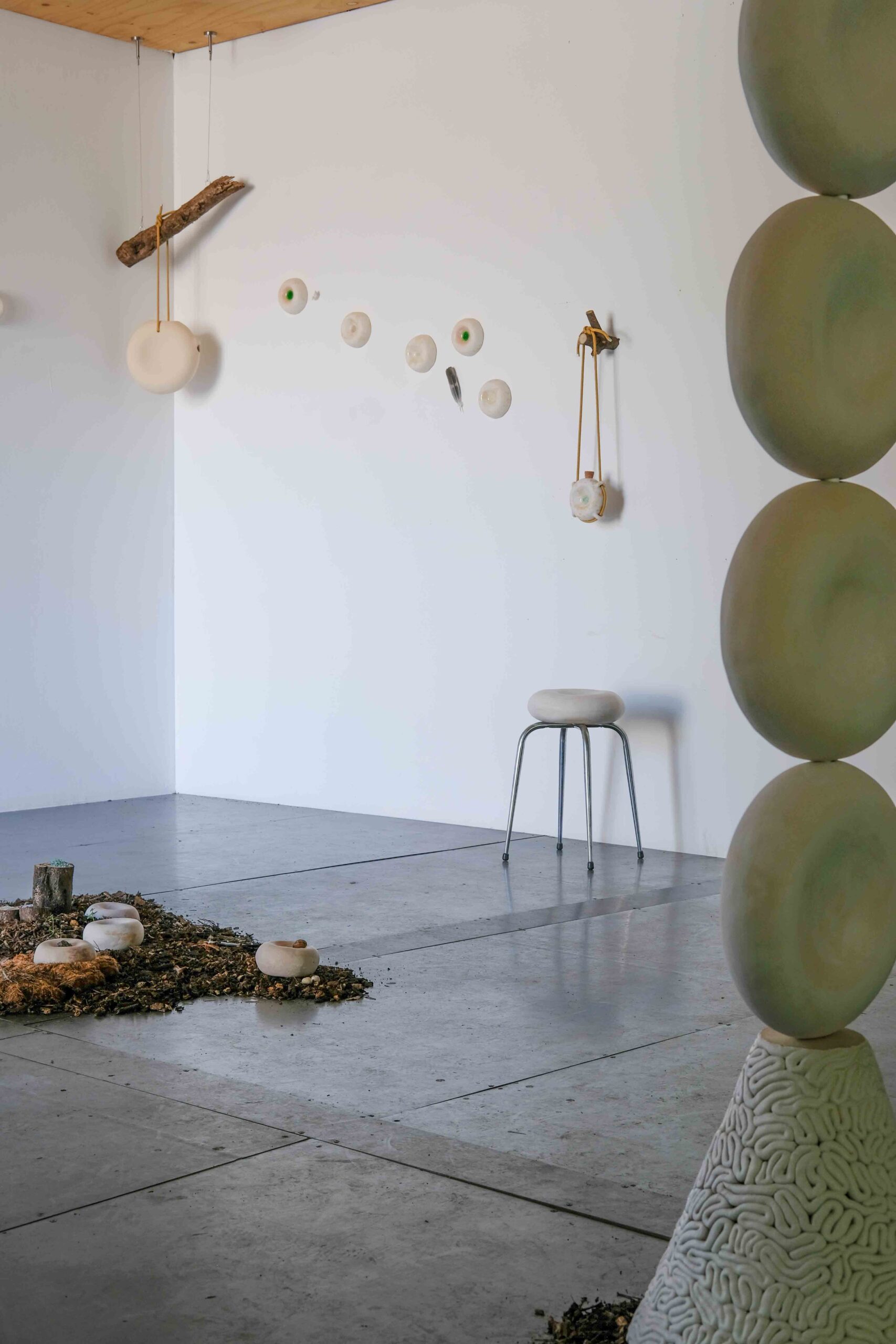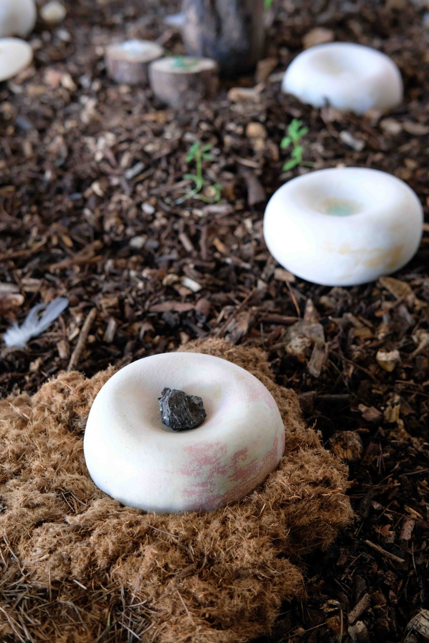 Le lieu en connexion avec le vivant m’a conduit à une recherche autour de la forme et de la fonction du globule rouge appliqué aux objets. En parallèle, j’ai mené une collecte sur place de matières minérales ou vivantes en expérimentant leurs interactions avec la céramique.